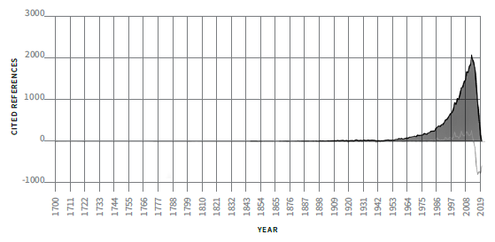 To deeply understand the use of references on these topics, Table 3 shows the Price index obtained for each year according to the number of bibliographic references used in articles published during those years. The number of articles published each year, the number of references included in those articles, the number of references that are five years old or less in relation to the year of the article's publication, and the Price index are shown in the Table 3. The result varies, but generally, the Price index is low, and the total percentage of references according to this index is 26.3 %.