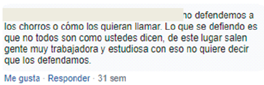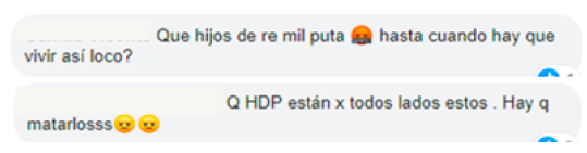 Siguiendo a Elias y Scotson (2016), la atribución de anomia, suciedad y características semihumanas o animales, ajenos al orden social, son algunos rasgos de la estigmatización de un grupo establecido hacia otro marginado. Como afirmamos previamente, no contamos con respaldo empírico para sostener que quienes publican sean de los sectores establecidos del barrio. No obstante, tal como sostiene la bibliografía revisitada en el primer apartado de este texto, las esferas en línea y fuera de línea no funcionan como universos separados e independientes, sino que se encuentran conectados, en continuidad. Así, las lógicas de segregación de un territorio se recuperan en estos espacios virtuales y encuentran su eco en estas discusiones.