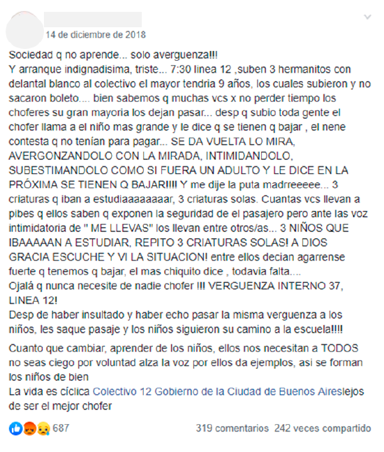 Aquí hay niños, "hermanitos con delantal blanco", que se dirigen a la escuela, no menores. La forista sostiene que son criaturas y no deben ser tratados como adultos, merecen respeto y ayuda. La publicación recibe numerosos comentarios que comparten la indignación: "Que lástima no estuve presente en ese colectivo por le ponía en su lugar su cerebrito al chófer; llevan a negros malvivientes gratis y mudos sin decir. Nada. Los dejan pasar. Sinverguenzas"; y, a la vez, felicitan a la forista por su buen accionar: "Dios te puso en el camino de esos niños, qué bueno que estabas, bendiciones, te felicito por tu acción"; "leí tu relato y se me llenaron los ojos de lágrimas"; "Dios te bendiga tienes un buen corazón".