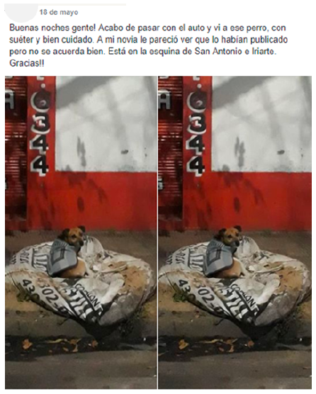 No todo es insultos e indignación en Seguridad en el barrio. También hay lugar para la compasión, la empatía y el afecto, y son los animales (no humanos), sobre todo los perros, los merecedores de esas emociones. En efecto, las publicaciones de repudio hacia los delincuentes conviven con una igualmente prolífica actividad de publicaciones y comentarios sobre los canes. El tono de estas y los diálogos son radicalmente opuestos al tópico anteriormente analizado pues, en este caso, se apela a un lenguaje de afecto y compasión.