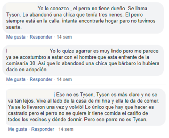 Los foristas reaccionan con angustia, compasión y bronca a las publicaciones de Osvaldo: "Devuelvan al perrito hijos de puta. Imagino lo que deben estar sufriendo". "Bendiciones y que Dios los guíe en esta búsqueda". "Dios quiera que aparezca sano y salvo, San Roque11 te protege Brun". "Cuenten conmigo si puedo ayudar en algo". "Se me parte el corazón". Las intervenciones demostrando pesar y brindando ayuda son comunes en estos casos, comentando si vieron o no al perro perdido en cuestión y, de haberlo hecho, en qué zona exacta fue avistado. También, los foristas operan como una suerte de veedores del bienestar de los animales del barrio, tanto los que se pasean solitarios por sus calles o los que están junto a sus dueños.