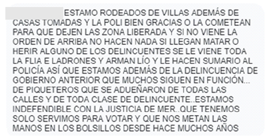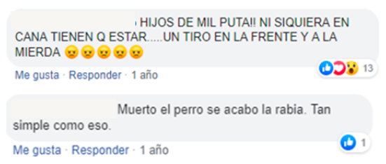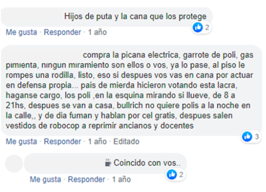 Una vez más, y de acuerdo con estos comentarios, la noción del delincuente como un sujeto perteneciente al reino de los animales no humanos figura como recurso para justificar su erradicación: si son una "plaga", la solución es la aniquilación. También entra en juego la noción de residuo o sobrante: "no sirven para nada", por tanto, no merecen la vida. Por supuesto que estas exclamaciones no implican un pasaje directo a la acción. No obstante, consideramos que, con estos escenarios como condición de lo decible, son parte de las narrativas. Estos intercambios denotan una intención o anhelo de ejercer la violencia, aunque eso no necesariamente implique que alguna vez vayan a ponerla en práctica No es posible expresarlo en cualquier contexto, no cualquiera considera factible seguir estas vías de acción, sin embargo, es una de las aristas del guion.