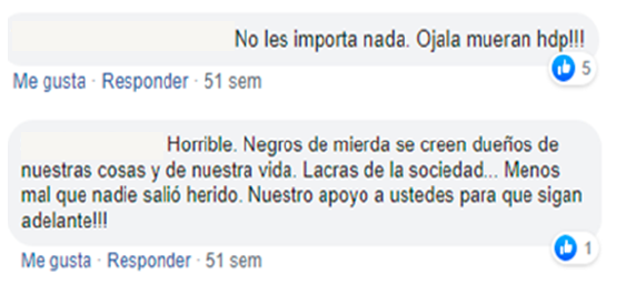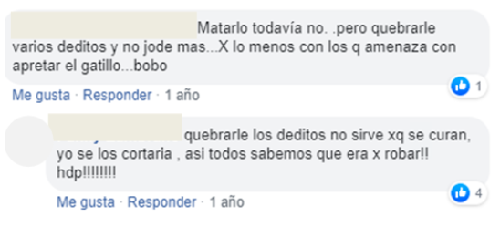 El 9 de enero de 2018 una mujer publicó que unos delincuentes ingresaron a su local y golpearon a su padre de 85 años. La publicación generó 95 comentarios y fue compartida 35 veces, suscitando reacciones virulentas entre los foristas. Entre comentarios de crispación, sentenciaron medidas drásticas para tomar hacia tales delincuentes, como se ve en la Figura 5.