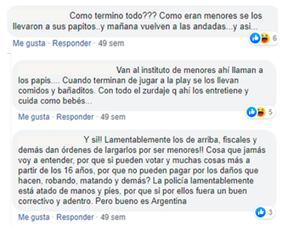 En estos comentarios se observa el disgusto respecto a la posibilidad de que los menores se comporten como niños que "jueguen a la play" en las instituciones de menores y se los trate como bebés. Desde esta mirada, no merecen recibir tal consideración: no son niños, son menores. Mucho menos tener comportamientos lúdicos propios de niños de clase media, tales como utilizar una PlayStation.