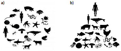 Con respecto a las preguntas que buscaban pesquisar la forma de estar en el mundo de los y las estudiantes interpelados, emergió una contradicción latente puesto que, al elegir entre dos opciones, pocas personas (8 %) identificaron su cosmovisión con la imagen de una pirámide de tres niveles, cada uno de los cuales representaba un escalón diferente de la cadena alimentaria. El nivel inferior de la pirámide estaba formado por plantas; el intermedio por animales herbívoros, y el superior por animales carnívoros. La silueta de un hombre se encontraba en la cima de la pirámide. La mayoría de las respuestas (92 %) se decantó por la imagen que mostraba un círculo con siluetas de diferentes especies animales y vegetales dispuestos en forma aleatoria, entre los que se distinguía la silueta de una mujer y, en el centro, la de un árbol.