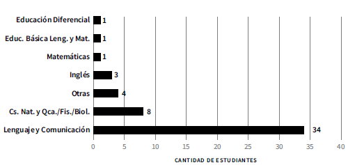 Los programas de estudio que cursaban las/os estudiantes en el momento de la encuesta son los que se indican en la Figura 3, donde el número sobre la barra da cuenta de la cantidad de personas de ese programa de estudio. Estos fueron Pedagogía en Educación Diferencial, Pedagogía en Educación Básica mención Lenguaje y Matemáticas, Pedagogía en Inglés, Pedagogía en Ciencias Naturales y Química, Ciencias Naturales y Física, Ciencias Naturales y Biología.