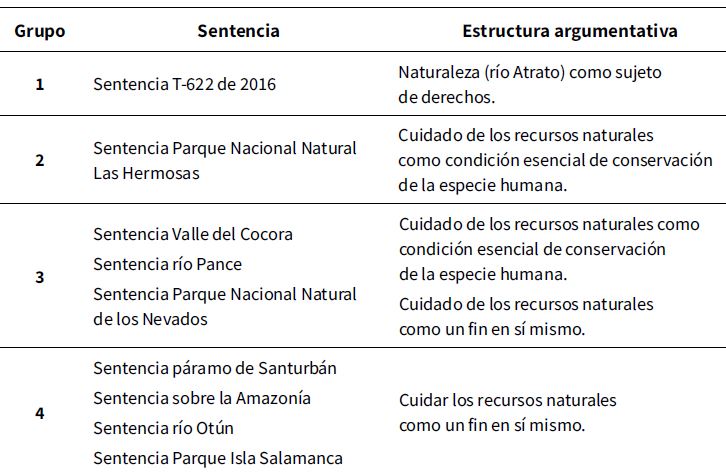 Estas decisiones judiciales se clasificaron en cuatro grupos (Cuadro 1). En el grupo 1, se ubicó la sentencia hito, generadora de toda esta construcción argumentativa en la que resultó posible declarar a los recursos naturales como sujeto de derechos: Sentencia T-622 de 2016. En el grupo 2, la sentencia que fundó su decisión de concebir los recursos naturales como sujeto de derechos con base en una posición antropocéntrica, en la medida en que fijó el deber de cuidado conforme al nexo de causalidad existente entre la conservación de la naturaleza con la protección de la vida de generaciones futuras. En el grupo 3, las llamadas sentencias de transición que zigzaguearon entre un paradigma y otro. Sus argumentos reposaron axiológicamente en la declaratoria de los recursos naturales como sujeto de derechos, pero conforme a criterios que incluyeron posiciones tanto antropocéntricas como ecocéntricas. Por último, en el grupo 4, las sentencias que confirmaron la instalación de un paradigma ecocéntrico en el interior de nuestro orden jurídico. Fueron decisiones judiciales capaces de romper la dualidad ser humano-naturaleza para fijar una posición integral en la que este forma parte del ecosistema, sin relaciones jerárquicas o de dependencia funcional en favor del desarrollo humano, y que hablaron del deber de cuidar y proteger los recursos naturales como fin en sí mismos.