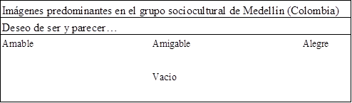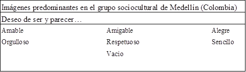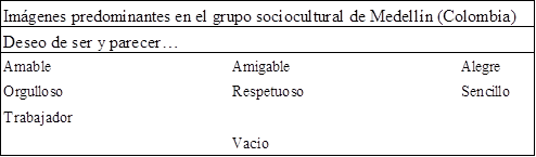 En Jang y García (en evaluación b) se ha presentado la segunda versión del cuadro de las imágenes predominantes en el grupo sociocultural de Medellín (Colombia), agregándole al cuadro anterior un valor más: ser sencillo: