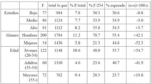 La tercera columna por la izquierda en la Tabla menciona la frecuencia absoluta (F), o número total de casos, de PIR en nuestra base de datos según cada uno de los factores (es decir, cada uno de los subgrupos por nivel de estudios, género y edad). La cuarta columna (total lo que ) muestra el número total de casos de cualquier tipo de lo que en los informantes (se dejan también a un lado los ejemplos de los entrevistadores y de cualquier otro participante). La quinta compara porcentualmente estas dos columnas previas (% F/total). La sexta de las columnas anota el porcentaje de casos de cada factor respecto al total de 254 datos en cada grupo de factores (% F/254). Por su parte, la séptima columna establece el número de casos de PIR que debería haberse esperado en relación con el total de datos de cualquier lo que según cada factor (este dato presente en la cuarta columna) (% esperado). La octava, por último, valora las diferencias entre los porcentajes de casos observados (o) y los esperados (e), multiplicando las diferencias entre ambas magnitudes por cien y dividiendo el resultado entre los casos esperados ((o-e)×100/e). Esta última columna permite valorar descriptivamente la importancia de las diferencias entre factores y, de esta manera, clasificar de una manera simple e inmediata el efecto de cada factor en cada grupo de factores independientes.