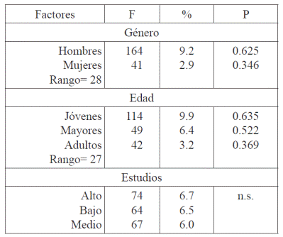 El cálculo confirma la significación del género y la edad, y la no significación del nivel de estudios. El grupo de factores más importante es el del género, con un rango de 28 y seleccionado en primer lugar durante el procesamiento estadístico: los hombres alcanzan una probabilidad de 0.625, por 0.346 de las mujeres. Por su parte, la edad tiene 27 de rango, y, en los factores del grupo, los jóvenes alcanzan la probabilidad más alta, de 0.635, mientras que los adultos muestran la más baja, de 0.369. Las personas mayores, con 0.522, favorecen muy ligeramente y quedan cerca de la neutralidad (significada por la probabilidad de 0.500).