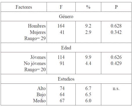 Aunque el nivel alto de estudios otorga un saldo ligeramente favorable al uso de la PIR (+3.7), las diferencias con los niveles medio (-3.0) y bajo (-0.8) son muy pequeñas; lo mismo se desprende al comparar los porcentajes de empleo: 8.2, 7.7 y 7.8, respectivamente. Las diferencias entre hombres y mujeres, en cambio, son bastante más marcadas, pues se pasa de un 11.2% en los primeros a apenas un 3.8% en las segundas, lo que se confirma con puntuaciones de +42.1 y -52.3 al confrontar los valores observados con los esperados. En cuanto a la edad, se producen también diferencias llamativas, con 10.6% en los jóvenes, 4.6% en los adultos y 9.4% en los mayores, así como con los correspondientes índices de +34.7, -41.9 y +19.8.