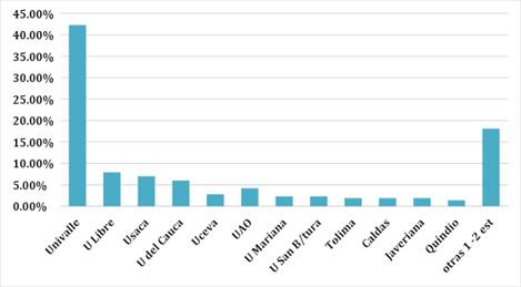 En la variable carácter procedencia académica se evidencia que el 62 % de los estudiantes proviene de una universidad pública, mientras que el 38 % de la privada. De las públicas, el 42 % son egresados de la Universidad del Valle; el 6%, de la Universidad del Cauca; y el 14%, de otras universidades públicas. De las universidades privadas, se destacan la Universidad Libre, la Universidad Santiago de Cali y la Universidad Autónoma de Occidente como universidades representativas (ver Figura 3).