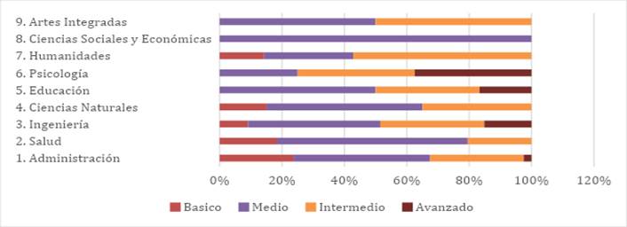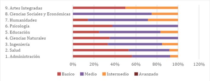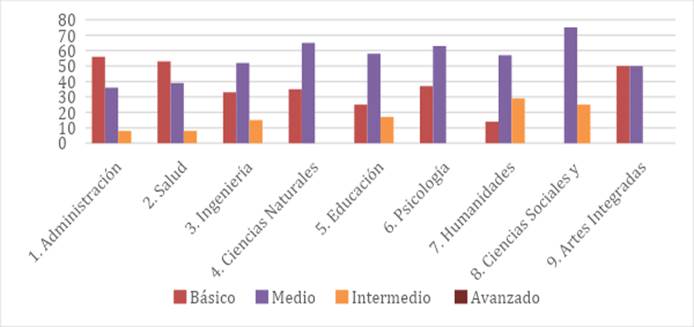 En el ND intermedio, el aporte mayor lo hace la facultad de Humanidades (43 %) seguido de Psicología y Educación, con 25 % cada uno, Ciencias Naturales (10 %), Administración (9 %), Salud (8 %) e Ingeniería (3 %). En este estudio, cabe añadir que ningún estudiante alcanzó el ND avanzado (ver Figura 9).