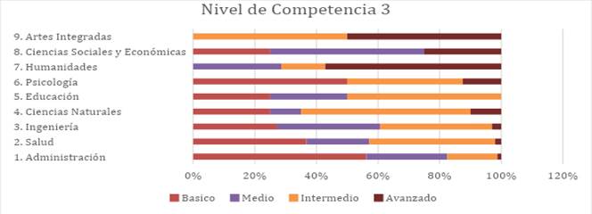 En el NC3, que corresponde a la relación entre situación de comunicación y situación de enunciación, se descubrió una mayor dispersión entre los ND. Se destaca un predominio del ND básico e intermedio, con buen aporte del medio y un porcentaje pequeño del avanzado. Este NC3 muestra un cambio en el comportamiento de las facultades e institutos. En el básico se ubican los estudiantes de Administración (56 %), Psicología (50 %), Salud (37 %), Ingeniería (27 %) y las demás Facultades con un 25 % cada una. En el ND medio se encuentran la de Ciencias Sociales (50 %), seguida de Ingeniería (33 %) y Humanidades (29%). En el ND intermedio, se hallan la de Ciencias Naturales (55 %), seguida de Educación y Artes, con el 50 % cada uno; Salud (41 %), Psicología (38 %) e Ingeniería (36 %). En el ND avanzado, se destacan la de Humanidades (57 %), seguido de Artes (50 %) y Ciencias Sociales y Económicas (25 %) (ver Figura 8).