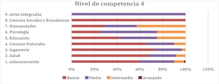 En cuanto al NC4, que indaga por la relación entre enunciación y argumentación, según facultades e institutos, se evidencia que la tendencia general es al ND básico. En este nivel se ubican las facultades de Ciencias Sociales (100 %), seguido de Ingeniería (73 %), Salud (67 %), Ciencias Naturales (65 %), Administración (59 %) Educación (42 %), Humanidades (25 %) y Psicología (25 %). En el ND medio encontramos a los estudiantes de las facultades de Artes (100 %) seguida de Psicología (50 %), Educación (33 %), Administración (31 %), Humanidades (29 %), Ciencias Naturales (25 %) y Salud e Ingenierías con el 24 % cada una.