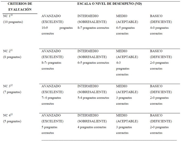 Como herramienta de puntuación se diseñó una rúbrica o matriz con los criterios de evaluación de la competencia en la lectura crítica con sus respectivas categorías (NC) y los diferentes niveles de desempeño o escala de valoración (en adelante ND) (ver Tabla 1).