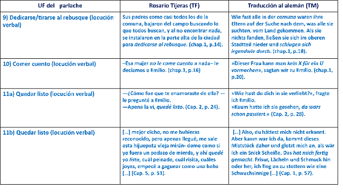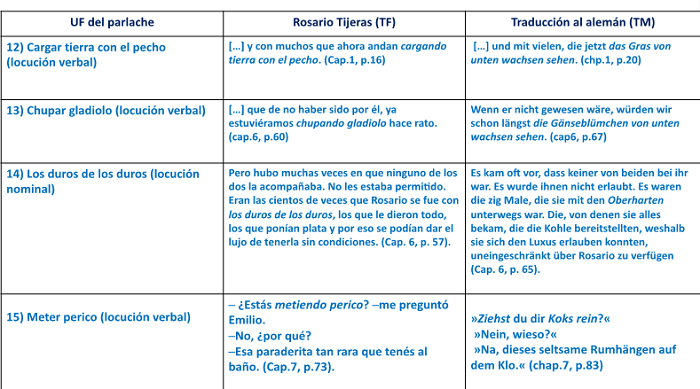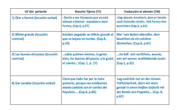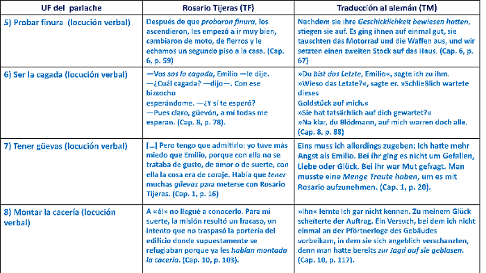 En las siguientes tablas se muestran las UF del parlache, el fragmento de la novela (TF) en las que aparecen y las traducciones al alemán de cada fragmento, incluida la UF.