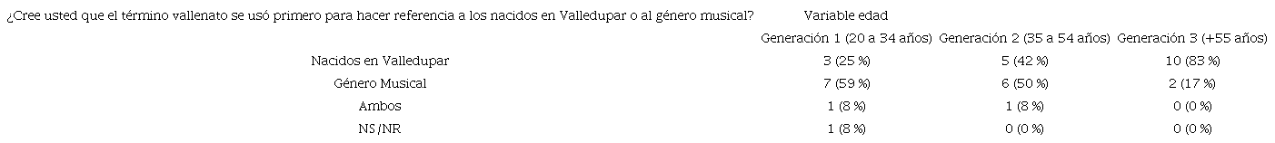 Esta es una pregunta cerrada, con dos opciones de respuesta. En ella se les pidió a los informantes que dieran cuenta del origen del término vallenato. En esta ocasión se les cuestionó su creencia acerca de si el término nombró primero a las personas nacidas en Valledupar o al género musical.