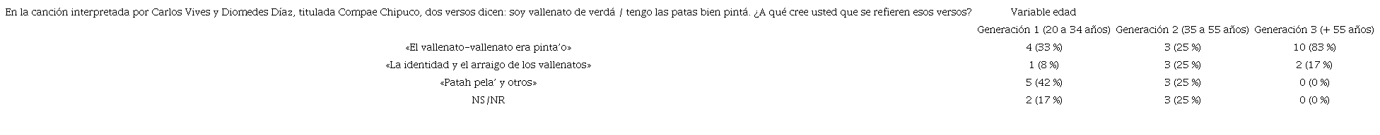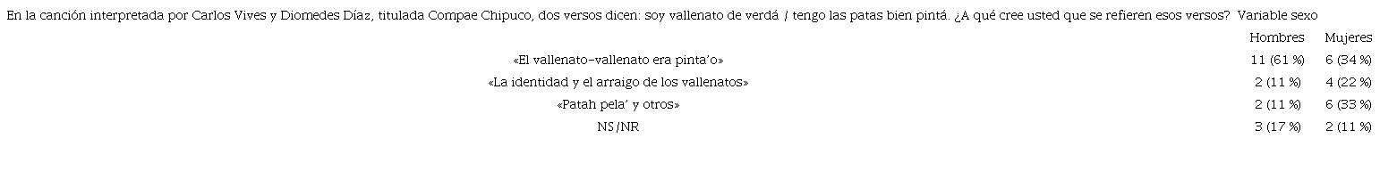 Esta es una pregunta abierta y está orientada a indagar por las creencias, percepciones y opiniones que tienen los hablantes sobre los versos soy vallenato de verdá/tengo las patas bien pintá, de la canción titulada Compae Chipuco.6