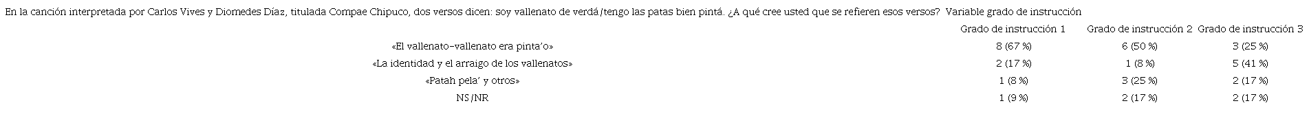 En este apartado, se puede resaltar que cada uno de los aspectos mencionados arriba incide significativamente en un grado de instrucción. En el aspecto referido a «el vallenato-vallenato era pinta’o», el 67 % de los informantes del grado de instrucción 1 relacionó los versos con ser o pertenecer a Valledupar. Con relación al aspecto «la identidad y el arraigo de los vallenatos», el 41 % de los profesionales entrevistados apuntó a que los versos se asociaban con la identidad folclórica y el hecho de sentirse propio de la ciudad. Finalmente, el 25 % de los informantes que se agrupa en el segundo grado de instrucción, se inclinó por la creencia que las personas de la ciudad andaban a pies descalzos.