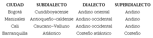 Sobre la clasificación dialectal del español colombiano, Montes Giraldo (1982) propuso dos superdialectos, el costeño y el andino, «diferenciados por la neutralización parcial de /b/~/f/, /x/~/g/ y /r/~/l/ que se da en el primero y no en el segundo; por la aspiración de la -s y la -n velar y por algunos fenómenos gramaticales y léxicos» (pp. 51-52). Además, subdividió el dialecto costeño en el del pacífico y del caribe, «diferenciados principalmente por el tuteo-voseo» (p. 52), en tanto que el dialecto andino lo clasifica en centro-oriental y centro-occidental. Basándose en isoglosas léxicas, propuso otros subdialectos, «como el cartagenero, el samario, el guajiro y el costeño interior en el caribe; el antioqueño, el nariñense-caucano, el tolimense-huilense, el cundiboyacense y el santandereano en el dialecto centro-oriental» (p. 52).