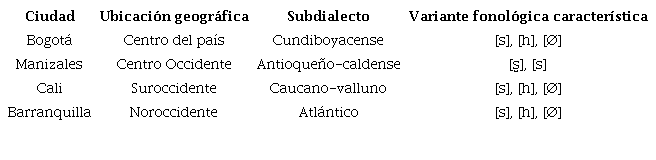 De acuerdo con los antecedentes de la investigación, en el habla bogotana la variable /s/ se conserva en el registro informal, pero tiende a perderse en los niveles socioculturales bajos; a su vez, el habla de Manizales se caracteriza por el uso de la variante apicoalveolar; en Cali, la variable /s/ tiende a aspirarse o a elidirse; y en Barranquilla la elisión de la /s/ es habitual incluso en hablantes de niveles educativos altos.