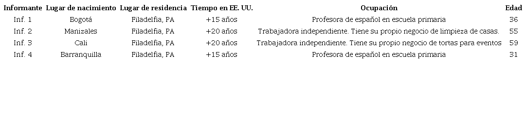 Informante 2: procede de la ciudad de Manizales, lleva radicada en Filadelfia poco más de 20 años y es actualmente dueña de una empresa de limpieza de casas. En ocasiones colabora con la atención de un restaurante de comida colombiana propiedad de una amiga suya. La entrevista se realizó en North Philadelphia. De acuerdo con lo expresado por la informante 2, su uso de la lengua inglesa es mínimo. A pesar de vivir en los Estados Unidos, establece una comunicación constante con colombianos de diferentes ciudades y varios latinos residentes en Filadelfia con quienes tiene lazos de amistad.
