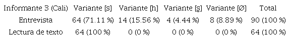 Los datos indican que la informante de Cali en su la entrevista presentó las tres variantes de la variable /s/; sin embargo, cuando se realizó el ejercicio de lectura, todas las variantes se omitieron, menos la variante [s], lo que indicaría que la informante de Cali percibe el uso de la sibilante como un registro de habla de prestigio.