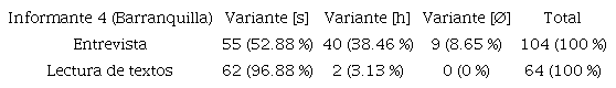 De la entrevista informal se obtuvieron 90 tokens. 64 con la variante [s], 14 con la aspirada [h], 8 con la elidida [Ø] y 4 con la apicoalveolar [s̺]: