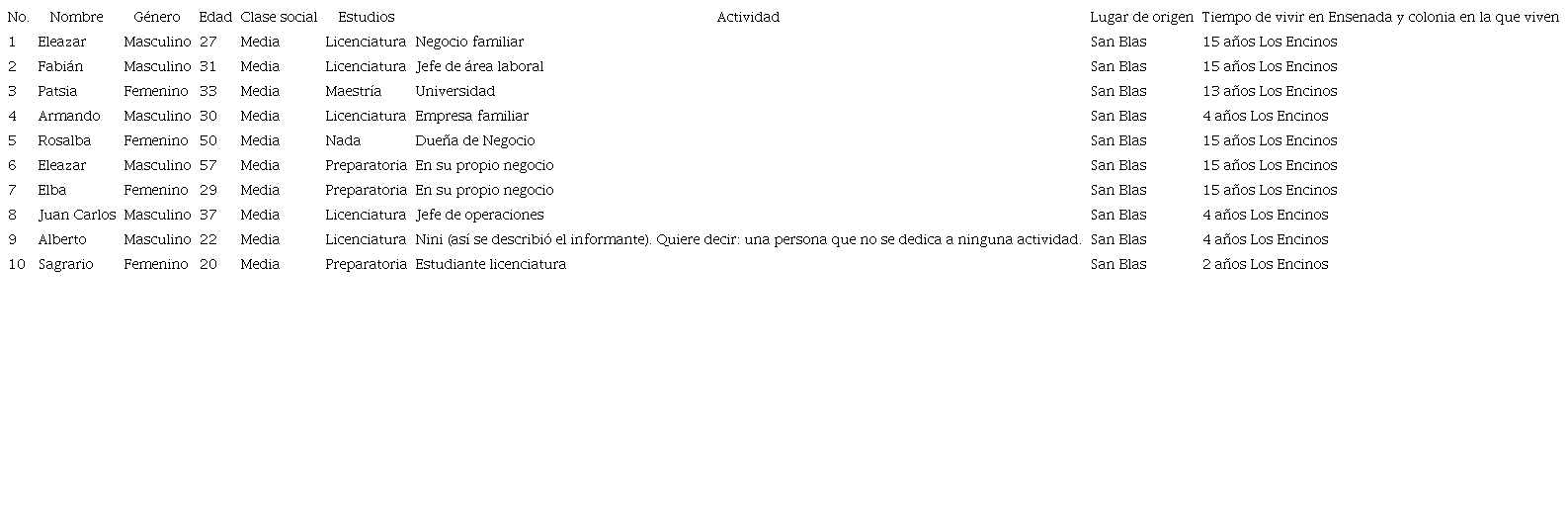 En la Tabla 1 se presentan los datos personales de los informantes por diversas variables. La familia zapoteca (Morales) fue abordada en las inmediaciones del Fraccionamiento los Encinos, una colonia del norte de la ciudad de Ensenada. Se acudió a ellos a partir de la técnica de bola de nieve, la cual consiste en localizar sujetos con las características requeridas de forma no probabilística y cuya localización se torna a veces difícil, (Alloatti, 2014). En el caso de este estudio, se les preguntó a los vecinos de las inmediaciones si conocían a personas que hablaran una lengua indígena, e inequívocamente señalaron el hogar de la familia Morales.