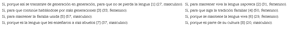 En la siguiente respuesta «para mantener viva la lengua zapoteca» [2], no solo el informante reconoció el deseo de mantener el idioma, sino que añadió una pasión por la viveza de la lengua zapoteca a la que llama «lengua», es decir, se reconoce en ella un idioma. Del mismo modo, las palabras del tercer informante «para que continúe hablándose por más generaciones» [3], se orientaron fuertemente hacia el componente conductual, al usar el verbo hablar, el cual se aplica para que las generaciones futuras transmitan la lengua.