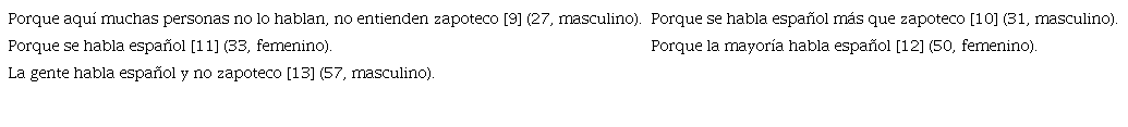 Las respuestas de los dos siguientes informantes son similares a otras que se han analizado. En la contestación «Es la lengua que les enseñaron a mis abuelos» [7], es interesante notar que nuevamente el hablante reconoce al zapoteco como una lengua, y en este caso, su respuesta se vincula al componente cognitivo, el saber, es el idioma de sus familiares, siendo este el punto de partida y la justificación para argumentar la importancia del zapoteco en el núcleo familiar. Es necesario resaltar aquí que la tradición familiar se encuentra arraigada, ya que los propios hablantes son observadores de su medio familiar, en donde han recolectado la información del uso del idioma de sus ancestros, deseando que perviva en las siguientes generaciones. La última respuesta «es parte de su cultura» [8], se cree que va en consonancia con el vínculo entre las tradiciones y la lengua.