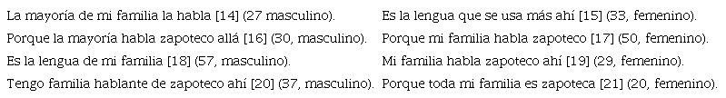 Así, los testimonios dejan ver un fuerte aprecio hacia el idioma, reiterando constantemente el origen familiar, pues como ellos dijeron, en la lengua zapoteca se hallan sus raíces y punto de origen: «es la lengua que les enseñaron a mis abuelos», según el testimonio 7. De este modo, en la lengua se observa, además, un tránsito del pasado hacia el futuro, pues en todas las respuestas se capta el deseo de seguir hablando zapoteco.