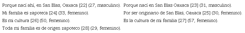 Para complementar esta última información sobre cuestiones identitarias, se presentarán las respuestas de la pregunta ¿Usted se considera? Zapoteco_ Indígena_ Otro_ ¿Por qué? A la cual todos los informantes afirmaron ser zapotecos, esgrimiendo las causas que aparecen en la Tabla 5.
