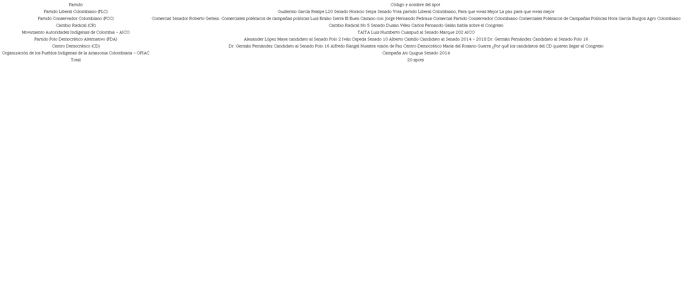 La muestra seleccionada es de tipo no probabilística, ya que «la elección de las unidades de análisis no depende de la probabilidad, sino de causas relacionadas con las características de la investigación» (Vilches, del Río, Simelio, Soler, & Velázquez, 2011, p. 88). Se seleccionaron 20 spots político-electorales televisivos de la campaña electoral para el Senado de 2014 (ver Tabla 1), que se caracterizan por hacer mención sobre la situación de Colombia.