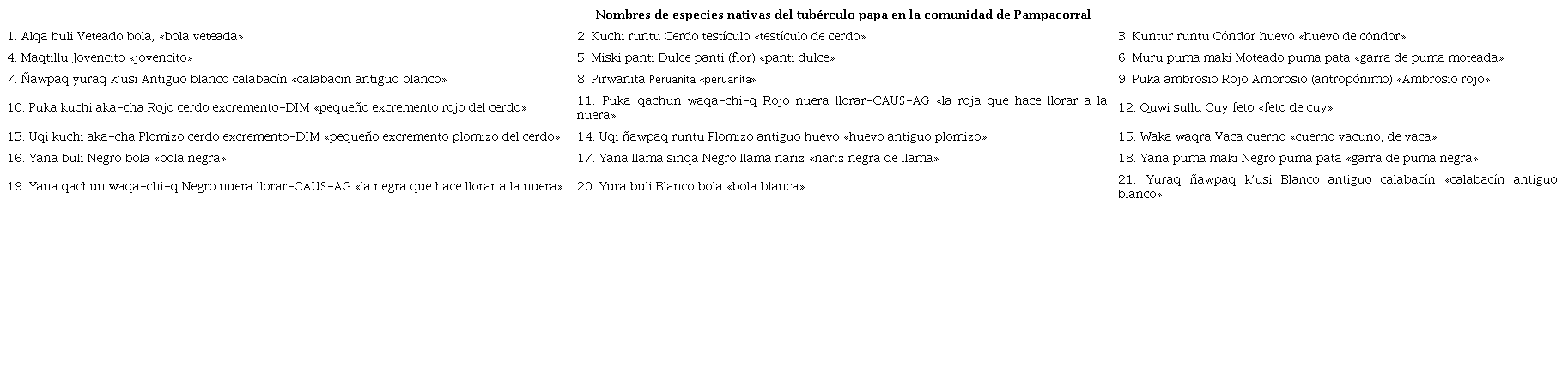 Además de contar con otros textos en donde aparecen formas lingüísticas quechuas acerca de términos referentes, en general, al tubérculo papa (Godenzzi, 1999; Rojas, 2007; Quispe, 2013), se contó con el material comunal in situ de la comunidad campesina quechuahablante de Pampacorral (Hancco, Blas, Quispe & Ugás, 2008). En este texto, patrimonio de su agrobiodiversidad, se ofrece un registro de las especies nativas de papas cultivadas en su sociedad junto a sus imágenes. En el marco de este trabajo de campo, el material posibilitó un primer acercamiento a sus fitónimos. Sin embargo, este primer contacto con los datos fue complementado con un proceso de elicitación, tanto para obtener formas lingüísticas correctas (i. e., transcripciones ortográficas elicitadas de primera mano), así como para rescatar aspectos extralingüísticos, tales como las propiedades o características de los tubérculos, el uso que la comunidad hacía de ellos en su sociedad, la cosmovisión, entre otros conocimientos enciclopédicos asociados a estos vegetales.