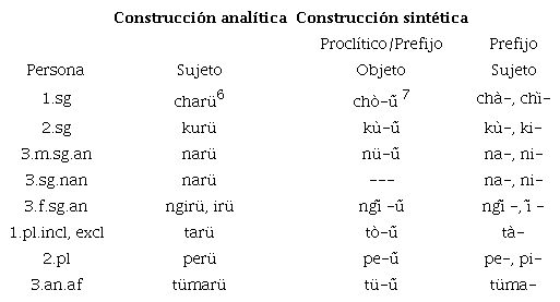 En términos morfológicos, se tiene conocimiento de que los sintagmas nominales son libres y ligados - alienables e inalienables-, los cuales expresan categorías de género y animacidad a través de la concordancia de los determinantes5. Asimismo, los verbos y otros elementos predicativos tienen referencia cruzada obligatoria para el sintagma nominal sujeto. Las formas personales son un paradigma de formas libres y de prefijos, como aparece en la Tabla 1 (ver también ejemplos (9) a (14), que ilustra la aparición de estos morfemas claves para entender el comportamiento de la negación).