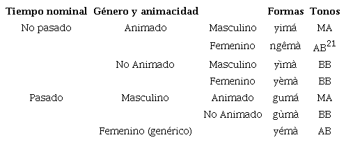 El verbo puede recibir dos prefijos de referencia cruzada: sujeto y objeto genérico -no animado- de tercera persona singular9. Si el sintagma nominal objeto se pospone al verbo se espera que el prefijo de referencia cruzada aparezca con el verbo, como ocurre en (5) con el verbo tá-na-dàtè-gü (‘partir’), cuyo segundo morfema remite a la fruta, objeto del verbo transitivo. Los nominales pospuestos i túa͂ ̀ y ya tǘè de los ejemplos (5) y (6) manifiestan el género (femenino i, masculino ya o a) 10 con un proclítico: