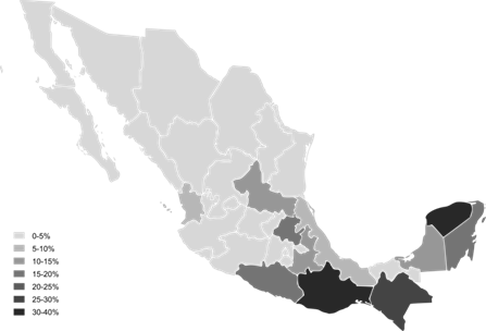 De acuerdo con este mapa y considerando las observaciones hechas a la Tabla 1, podemos observar que es en el sur de México en donde se localizan las mayores poblaciones de grupos indígenas, destacando particularmente Oaxaca, Chiapas (suroeste del Pacífico) y Yucatán (Península de Yucatán), en donde casi el 40 % de sus habitantes puede hablar y comprender al menos un idioma indígena. De ahí, estados como Quintana Roo y Campeche (península de Yucatán), Guerrero, Nayarit (suroeste y centro del Pacífico), San Luis Potosí, Hidalgo y Puebla (noreste y centro de México) cuentan con una densidad de hablantes que va de un 30 % a casi un 15 % de su población. Por su parte, el estado de Veracruz (Golfo de México), muestra una distribución de hablantes que gira en torno al 10 y 15 %, en donde se destacan principalmente las lenguas náhuatl y totonaca. Finalmente, en el resto del país, de manera especial en la región norte, son pocas las personas que se reconocen como hablantes de alguna lengua indígena, ya que su distribución llega hasta un 5 % entre sus habitantes.
