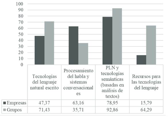 De acuerdo con la Figura 2, la mayoría de las herramientas de PLN que se adquieren en México se enfocan en el procesamiento semántico, lo que cubre tareas de recuperación y extracción de información, minería de textos, ontologías, así como la generación de vectores de palabras (ing. word embedding). De ahí, los demás productos se orientan hacia el procesamiento de texto -p. ej., motores de búsqueda, reconocedores de caracteres, correctores ortográficos, etc.-, el procesamiento de habla y sistemas conversacionales -mayoritariamente, chatbots-, así como la generación de recursos e insumos, como es el caso de los corpus lingüísticos -orales y escritos-. Finalmente, existen dos claros proveedores de estos recursos: consultoras y empresas tecnológicas -identificadas como empresas-, junto con laboratorios y grupos de investigación universitarios -etiquetados como grupos-.