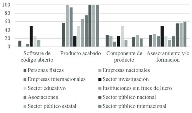 Con base en la información de la Figura 3, el principal consumidor de estos recursos es el sector público gubernamental, cuyo mecanismo de adquisición son los fondos para el fomento de la investigación y creación de nuevas tecnologías. En este sentido, también hay una participación importante de empresas nacionales e internacionales. Todas ellas apuntan su interés a la compra de productos concluidos, ya sean prototipos, ya sean sistemas validados listos para su manufactura y distribución. Por otro lado, en rubros como el asesoramiento tecnológico, la formación de recursos humanos, la creación de componentes o la generación de software libre son del interés de sectores como la academia, asociaciones sin fines de lucro y personas físicas que requieren de herramientas concretas para resolver sus necesidades.