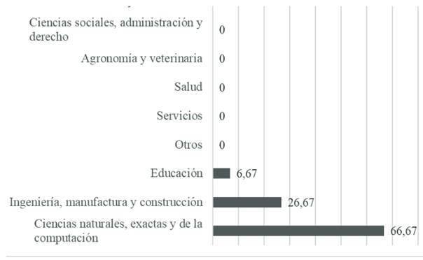 Para concluir con esta sección, en la siguiente figura se muestra cuáles son las áreas de conocimiento con mayor actividad dentro del área de PLN. En resumen, se observa una tendencia que se ha generalizado en buena parte de América Latina, que es considerar a dicha área como un asunto para grados y posgrados en ciencias de la computación, ingeniería computacional o de software, informática y otras similares. En contraparte, si bien hay un interés por parte de carreras humanísticas en esta área, lo cierto es que sigue siendo una tarea preferentemente técnica. Veamos: