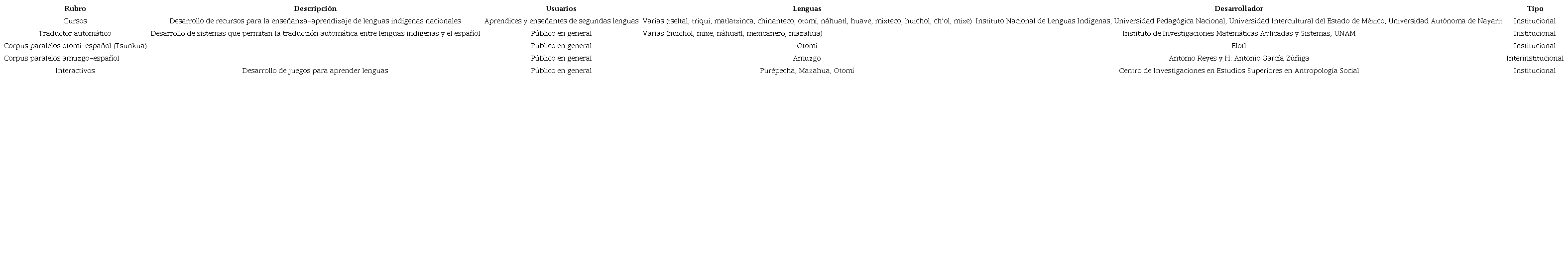 Como punto relevante hay que decir que, inclusive, se ha explorado el diseño de aplicaciones genéricas, las cuales pueden adaptarse a cualquier idioma indígena, sin necesidad de crear recursos específicos para ello. Éste es el caso de Miyotl (Álvarez, 2019), gestada por la Universidad Autónoma de Chapingo. Con la finalidad de hacer una síntesis de todos los recursos que hay hasta hoy en día para las lenguas originarias, presentamos la siguiente tabla: