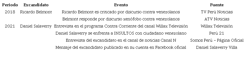 El corpus está compuesto por a) discursos orales producidos por el excandidato a la alcaldía de Lima de 2018, Ricardo Belmont; b) discursos orales producidos por el excandidato a la presidencia de Perú del 2021, Daniel Salaverry; y, finalmente, c) discursos escritos configurados por cibernautas en las redes sociales Twitter y Facebook y YouTube. Se han seleccionado estas redes sociales, dado que, durante los últimos años, son las redes más consumidas por los usuarios peruanos en la web (Newman, Fletcher, Schulz, Andi, Robertson & Kleis, 2021). Por otra parte, se escogieron a los excandidatos Ricardo Belmont y Daniel Salaverry porque son dos casos públicos destacados del discurso político antimigratorio en las últimas elecciones políticas peruanas en niveles locales y nacionales. Si bien para ambos los resultados en las elecciones fueron negativos, los efectos y las reacciones producidos en la sociedad, especialmente en el ciberespacio (Díaz, 2021), fueron significativos, dado a la sensación generada. Para la recolección del corpus, se seleccionaron entrevistas y mensajes de ambos excandidatos en las redes sociales. A continuación, en la siguiente tabla, se explicita, por cada excandidato, el evento donde produjo el discurso seleccionado para el corpus, así como el año y la fuente: