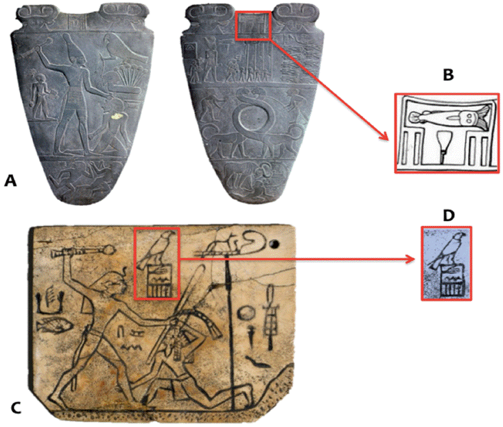 La Paleta de Narmer (fines del cuarto milenio a.C., I Dinastía) (Figura 1), a través de una caracterización indicial, plantea el uso de la escritura al servicio de la autoridad política emergente, enfatizando que el desarrollo del Estado acompañó el proceso de burocratización del sistema de escritura. En la parte superior del objeto, se encuentra el serej («fachada del palacio») (Figura 1b), indicador de la centralización política y antecesor de la cartela tradicional que se empleaba para escribir el nombre de los faraones. El serej posee una conexión directa ―a modo de índice― con la entrada al palacio, sede por antonomasia del poder político y sinónimo de ordenamiento del espacio social y cósmico.