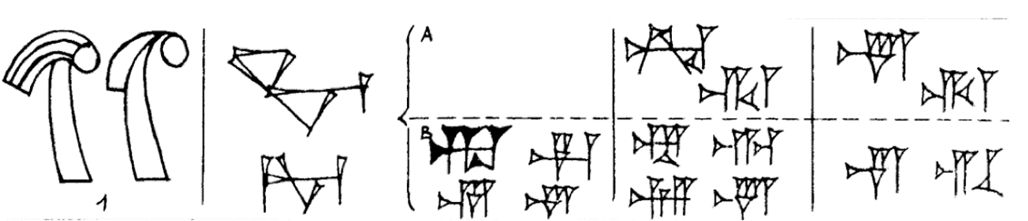 Durante el tercer milenio a.C., se utilizó una combinación de cinco signos cuneiformes, entendidos como simples trazos, a partir de los cuales se dio lugar a otros: