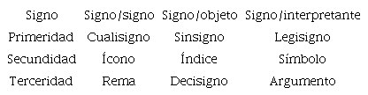 La tríada signo/objeto/interpretante da lugar a la clasificación de signos resumida en la Tabla 1 y refiere a la relación del signo consigo mismo, el vínculo del signo con el objeto y el nexo entre el signo y el interpretante (Preucel, 2006, p. 56). En esta concepción, la relación signo/signo (representamen) refiere al punto inicial de la semiosis o primeridad; la de signo/objeto a la de secundidad; y la de signo/interpretante a la terceridad.