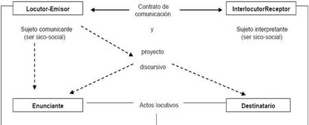 Otros elementos que deben ser analizados en este dispositivo, al momento de construir y comprender el sentido de la situación comunicativa son el contrato de comunicación y el proyecto discursivo. El primero es definido como «lo que estructura una situación de intercambio verbal» (Charaudeau, 2009, párr. 8). En otras palabras, es lo que permite conocer, antes de la manifestación de la palabra, los roles que los sujetos juegan y las intenciones subyacentes en un acto comunicativo. El segundo alude a las intenciones de los sujetos en el intercambio comunicativo. El reconocimiento de dicho proyecto constituye una necesidad básica para la intercomprensión, pues su desconocimiento puede llevar a ofrecer respuestas contrarias a los intereses del sujeto hablante o, peor aún, a sucumbir ante ellos cuando incluso están en contra de los intereses propios.