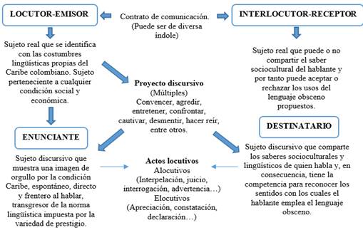 Por otra parte, de acuerdo con Charaudeau (1992), este hablante crea unos sujetos discursivos: un enunciante y un destinatario. En el corpus analizado, el enunciante es un sujeto que se muestra orgulloso de su condición Caribe y que no trata de ocultarla ni de disimularla. En otras palabras, a través del enunciante, el hablante al emplear la obscenidad desea mostrarse espontáneo, directo y frentero al momento de hablar, más importante aún, transgresor de la norma lingüística impuesta por la variedad de prestigio en el país. El destinatario por su parte, como creación discursiva del sujeto hablante, solo está en el imaginario de este, es decir, quien habla imagina que quien le escucha es un ser que comparte los mismos saberes sociales y culturales de los habitantes de la Región Caribe. Así pues, el locutor considera que su destinatario es competente para comprender los sentidos asignados a la obscenidad en cada situación comunicativa.
