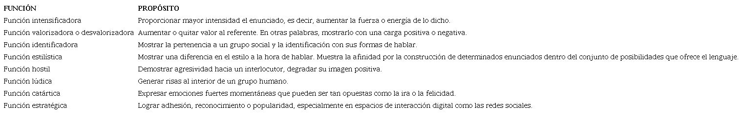 En consonancia con lo expuesto, en el presente trabajo se considera que el lenguaje obsceno cumple las siguientes funciones: intensificar el enunciado, valorizar o desvalorizar el referente, generar identidad y fraternidad, demostrar un estilo de habla diferenciado, mostrar hostilidad hacia el interlocutor, provocar risa y complicidad, expresar emociones y lograr mayor popularidad en un grupo. Estas pueden aparecer solas y ser fácilmente identificables o superpuestas unas con otras y, por lo tanto, tener un grado más alto de complejidad en su identificación. A continuación, se esquematizan las particularidades de cada función y su propósito discursivo: